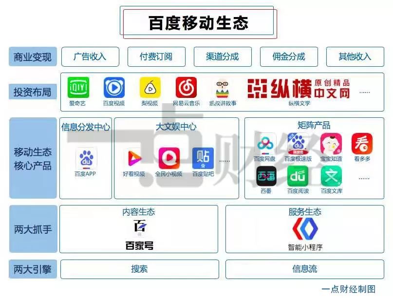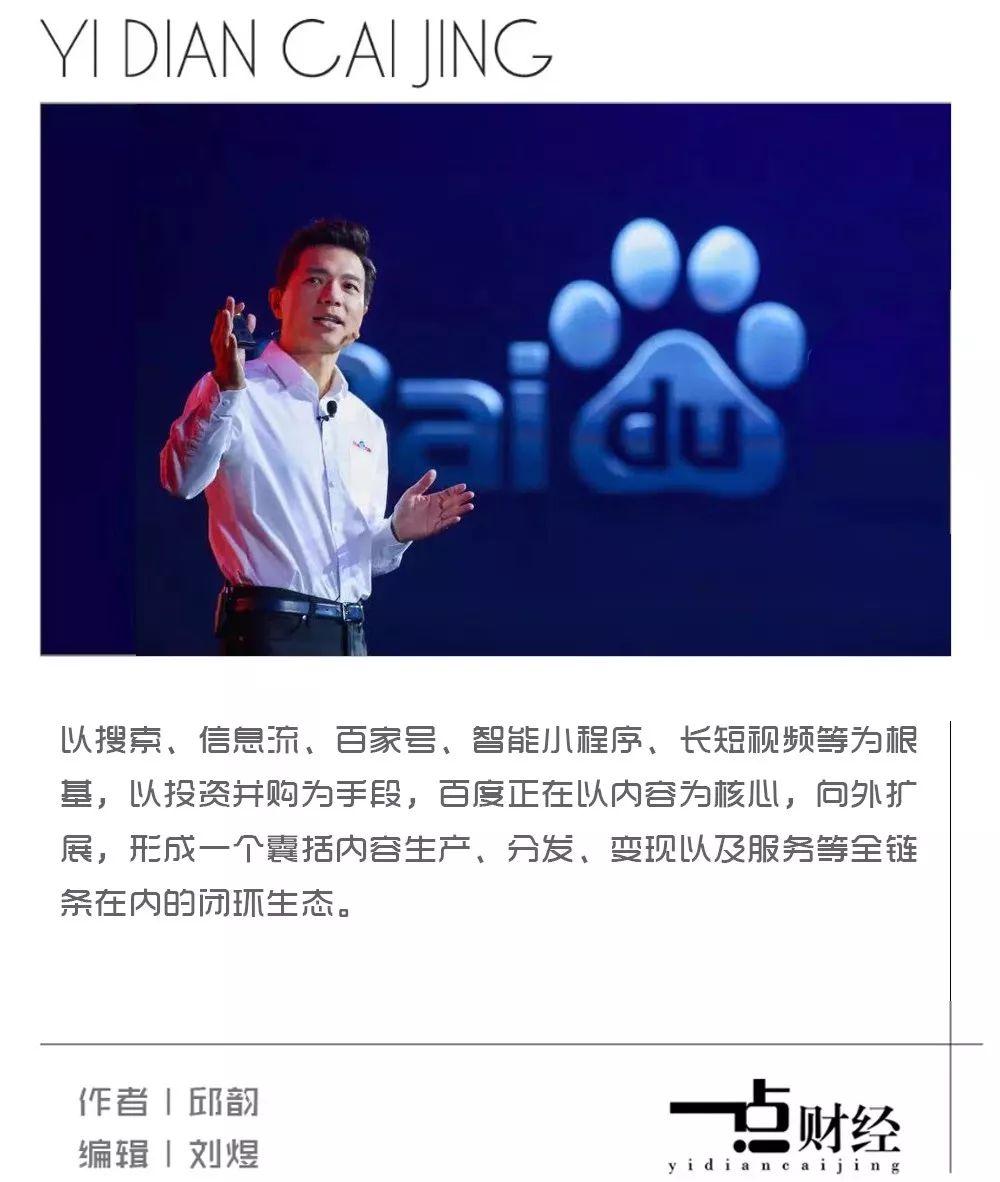 从信息流、智能小程序到现在的移动生态构建,这种重建甚至重构已经开始。以搜索、信息流、百家号、智能小程序、长短视频等为根基,以投资并购为手段,百度正在以内容为核心,向外扩展,形成一个囊括内容生产、分发、变现以及服务等全链条在内的闭环生态。