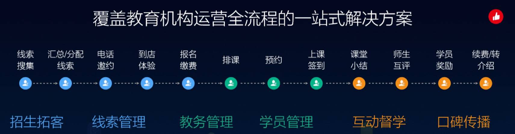 除了招生获客,有赞教育还覆盖了教育机构的全流程:从线索收集、线索分配、电话邀约,到报名缴费、排课、预约、上课签到,再到课堂小结、师生互评、学员奖励、续费,都将被纳入有赞教育的精细化管理体系中。