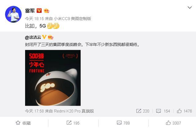 当然,vivo的老对手小米也没有落后,今天下午18:15,雷军转载了小米公关总经理@徐洁云的微博,并平均到:比如,5G。不然猜测出小米也将在下半年发布5G新机,前不久小米才进入全球500强,下半年或者下个月就发布5G新机也并不是没有可能。