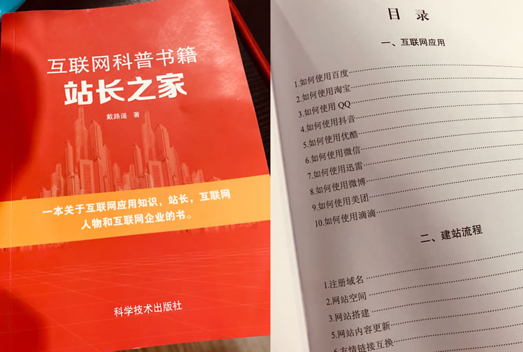 前几天收到了由戴路遥编著的《互联网科普书籍-站长之家》,打开书一看把我惊呆了,大家可以先看一下图书封面和目录。