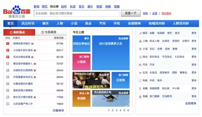 百度搜索风云榜是百度以数亿网民的每日搜索行为作为数据基础,建立的权威全面的各类关键词排行榜,包括了娱乐、人物、小说、热点、汽车……各个行业的热搜数据。