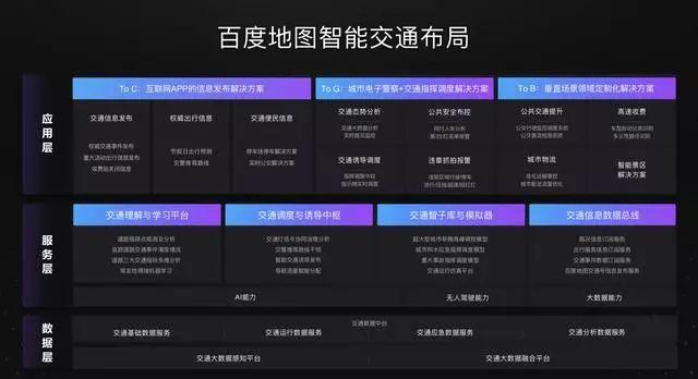 百度地图不是孤军作战,李莹认为,"百度地图是 AI 的基础能力,也是 AI 典型的落地场景",百度地图是百度 AI 生态的基础设施。现在百度地图的 API 已被应用在百度系所有产品中,包括百度 App、Apollo、小度音箱等 AI 产品;百度地图与百度智能驾驶战略协同,无人车高精地图由百度地图提供,MapAuto 是面向前装的智能出行解决方案;百度地图与智能云深度协作,作为核心能力,面向物流、交通、旅游、智能城市等行业提供解决方案。5G 时代,百度AI生态的储备也将得到释放,不论是智能搜索、智能驾驶、智能音箱、智能云还是智能城市,百度地图都将与百度 AI 生态更深入地协作。