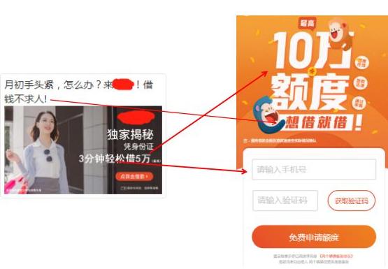 着陆页:“10万额度”、“想借就借”与“借钱不求人”呼应,只需输入手机号与“轻松借”呼应。