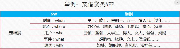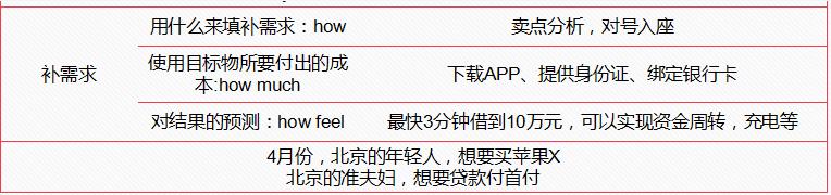 所以老牛针对借钱这个需求产生的诉求是:额度大、到账快。按照这个思路可以收集到很多场景,例如: