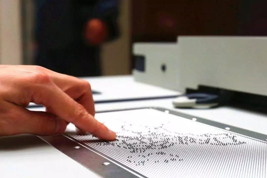 去年国际盲人日当天,在清华大学召开的“包容与多样——无障碍发展国际学术大会上”,清华大学未来实验室主作徐迎庆教授发布了大幅面触觉图形显示终端产品原型。它可以把图片转换为由凸起和收回的点组成类似盲文的点阵,这些点阵可以在盲文和图形成自由切换。