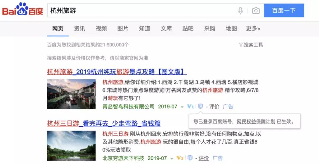 为了更全面的护航搜索,百度在PC端和移动端均启动了“百度网民权益保障计划”,具休表现便是搜索广告的下方会有“保”字标识。用户在登陆百度帐号后,点击广告如遭遇虚假、欺诈等情况并造成损失,可向百度提供相关证据申请权益保障,通过反馈不断优化上网环境。