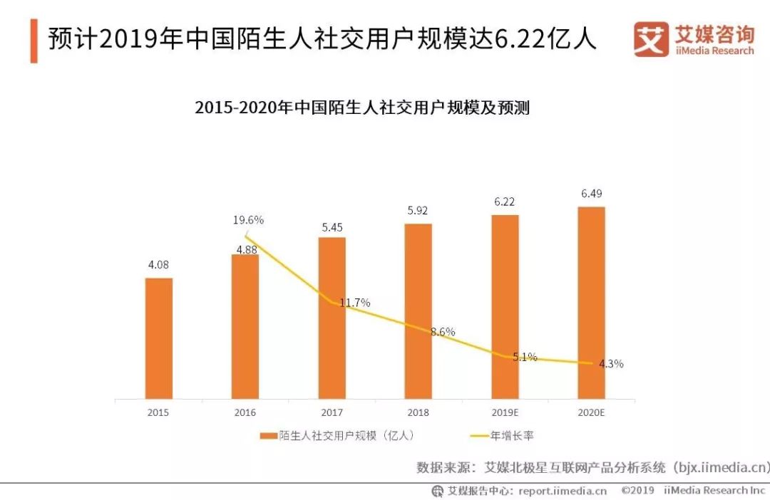 大厂们对陌生人社交的热情不是没有道理。艾媒咨询的报告显示,2018年国内陌生人社交用户规模达5.92亿,2019年将达6.22亿。在互联网进入存量争夺时,陌生人社交领域还有足够的增长空间。对于普遍存在流量饥渴的互联网公司来说,这是一个相当大的诱惑。