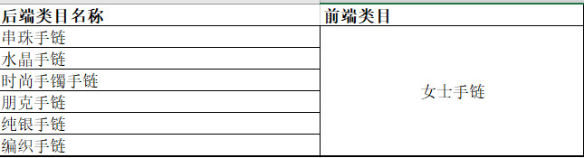 鉴于以上我说的比较虚,那么还是给大家上图可能领会的更加真切一点。拿女士手链举例,一般消费者看类目只会看女士手链,而后台的商品则能仅仅以女士手链这一个维度来分类,这样更加便于商品的维护与整理。往往一个前端类目会有一个或者多个后端类目映射而来,而这个前端类目则是后端类目的代言人。
