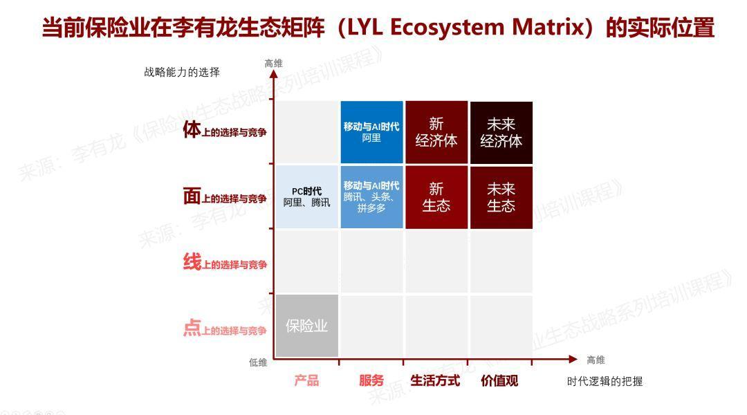 讨论保险这项服务在李有龙生态矩阵的位置,要同时讨论保险的两个属性,一个是从点线面体的战略选择上,保险行业隶属于那个维度?一个是从产服生价的发展阶段上,保险业应当处于什么阶段?