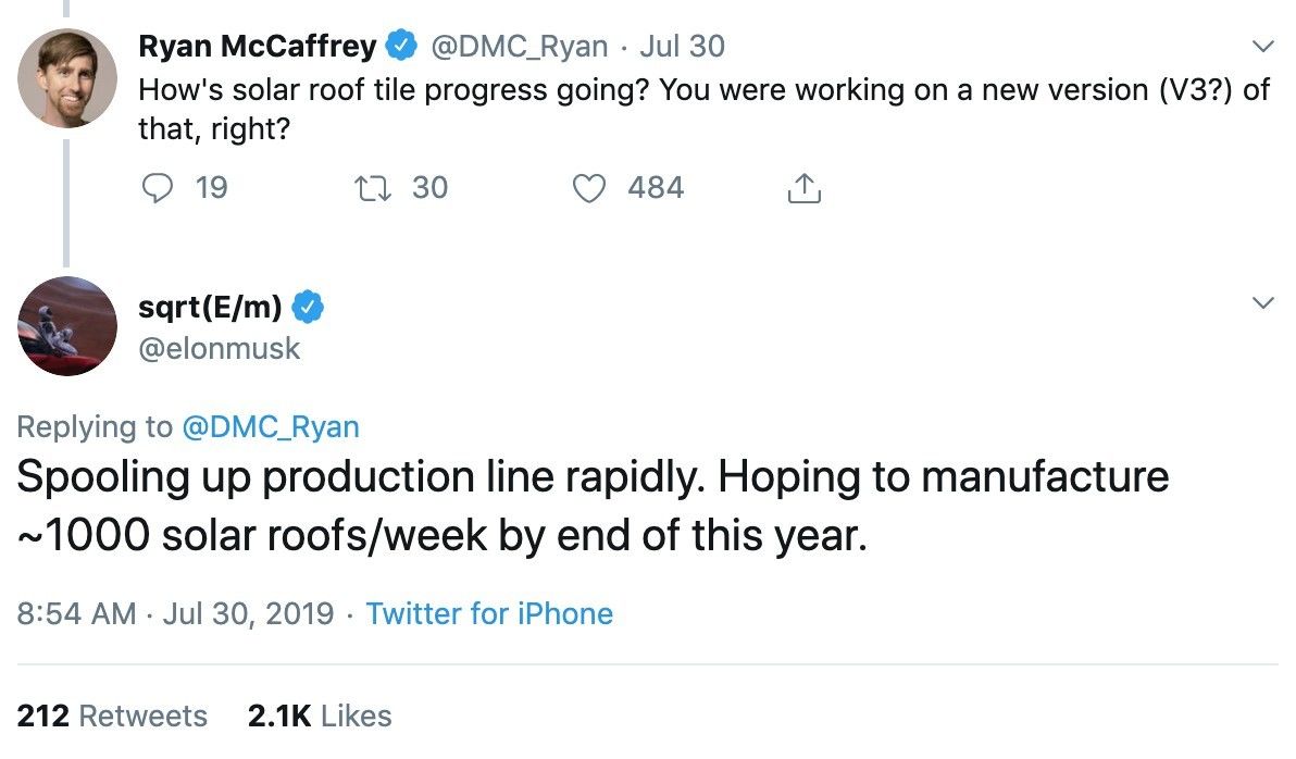 这条有争议的推文与特斯拉公司的太阳能屋顶有关。马斯克在 2016 年末首次发布了这款太阳能屋顶,但一直难以大规模生产。当一名关注者询问该产品的最新进展情况时,马斯克在推文中回复称,他希望公司能在今年年底前每周生产 1000 个太阳能屋顶。