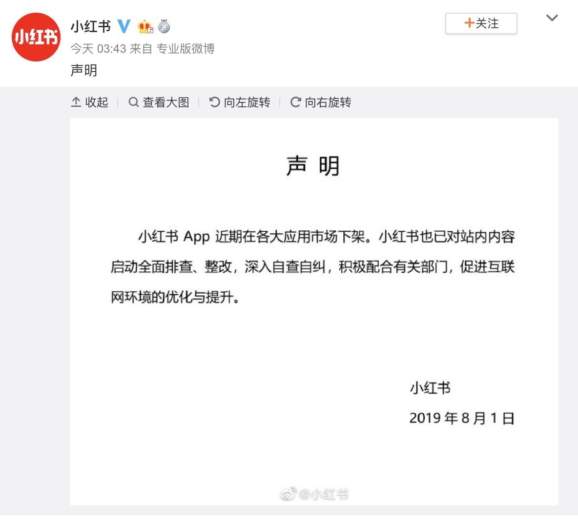 8 月 1 日早间消息,小红书通过官方微博发布声明称,针对其 App 近期在各大应用市场下架,小红书已对站内内容启动全面排查、整改,深入自查自纠,积极配合有关部门。(来源:36Kr)