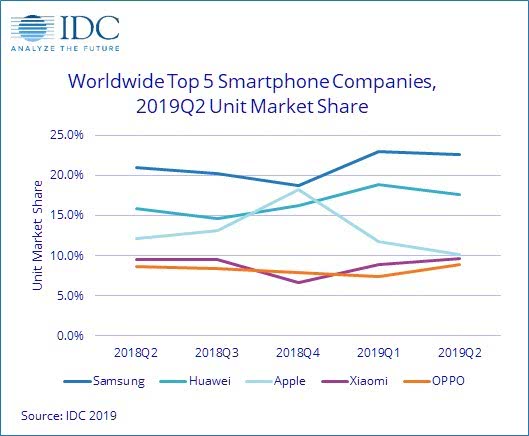 IDC:二季度华为手机出货量坐稳全球第二 小米逼近苹果