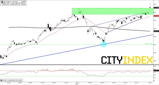 最为积极的是,苹果公司自5月1日高点回落之后,正在为今年构筑一条新的上升趋势。3月至12月的跌势之61.8%回档提供的稳固支撑也很好地证实了这一点。随着股价周三冲高,苹果高开,上破2个月以来楔形形态并创下2019年新高。前今年高点215美元应构筑区间支撑。如以4月底/6月初208美元高点为底部的近期缺口填平,或意味着苹果股票将迅速重拾涨势。但若下破支撑,则需更为谨慎。届时,买家需关注股价于关键上涨趋势线附近的表现。