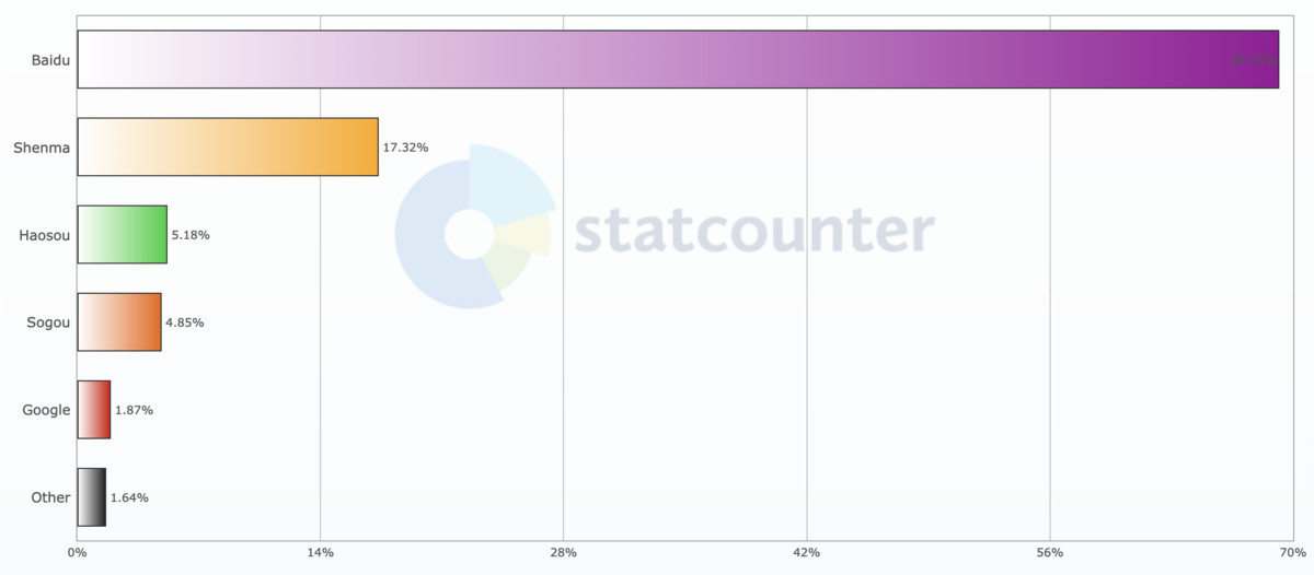 来自statcounter的数据显示,百度依旧占有中国搜索引擎市场近70%的市场份额,搜狗占有近5%的市场份额。