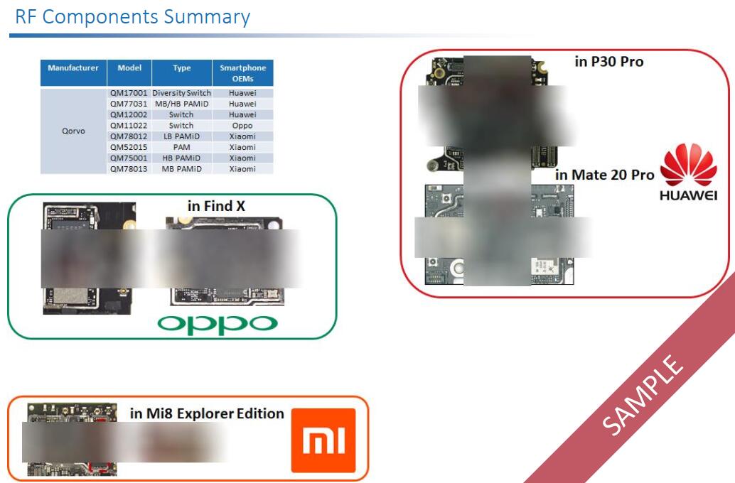 本报告旨在深入研究智能手机中射频前端模组和器件的技术情况,包括八款旗舰智能手机:Apple iPhone XS / XS Max、Apple iPhone XR、三星Galaxy S9 Plus X美国版和欧洲版、三星Galaxy S10 Plus欧洲版、华为Mate 20 Pro、华为P30 Pro、小米Mi8 Explorer版和OPPO Find X。