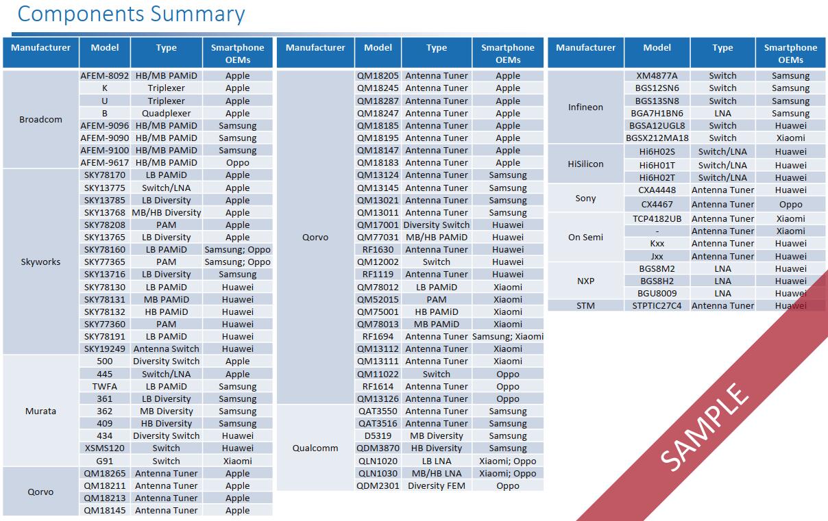 通过拆解各种智能手机,我们提取了从收发器到天线的主要射频前端模组及器件,并进行物理分析。本报告研究涉及封装、尺寸和技术,以提供智能手机OEM厂商的射频技术选择和市场情况。目前,手机射频领域的主要厂商是Qorvo、博通、Skyworks、村田、高通,但我们也分析了其它供应商。