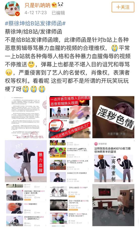 4月12日下午,@蔡徐坤工作室 发出律师函,称B站上存在大量严重侵犯蔡徐坤权利的内容,而且点击量高、传播范围广,影响十分恶劣。