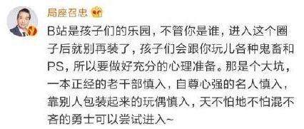 早几年就玩转B站的局座也对这个现象表达过自己的看法:“不管你是谁,进入这个圈子后就别再装了……靠别人包装起来的玩偶慎入,天不怕地不怕混不吝的勇士可以尝试进入。”