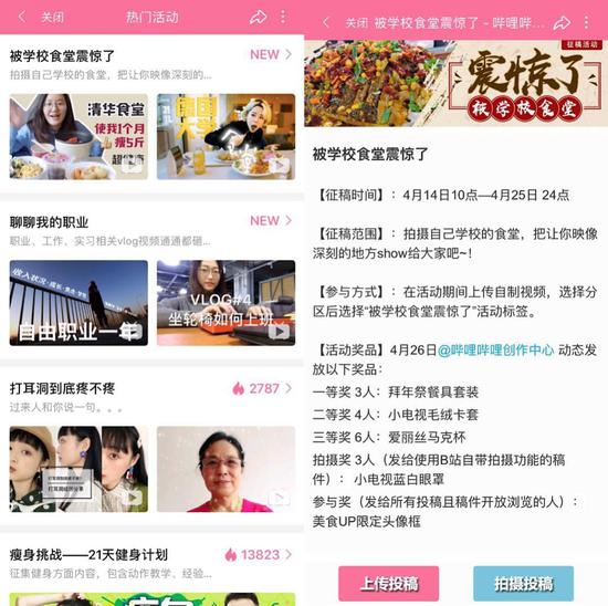 近期,B站还推出“热门活动”版块,征集话题视频。以粉丝数量较大的UP主作为范例,设置投稿时间,并对参与用户进行奖励。