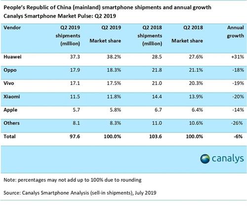 2019年第二季度国内手机市场分析 华为遥遥领先