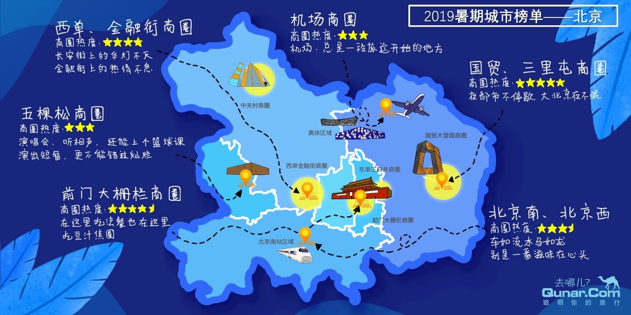 去哪儿网官方表示,城市旅行热力榜参考了交通枢纽、酒店入住率、景点客流量等多项旅游数据指标。以北京为例,尽管其中不乏国贸大望路商圈、西单金融街商圈等传统的商业中心,同时也涵盖了首都机场、北京西站、南站、前门大栅栏等旅客聚集地,从而较为全面的折射出今年北京暑期旅游市场的发展图景。
