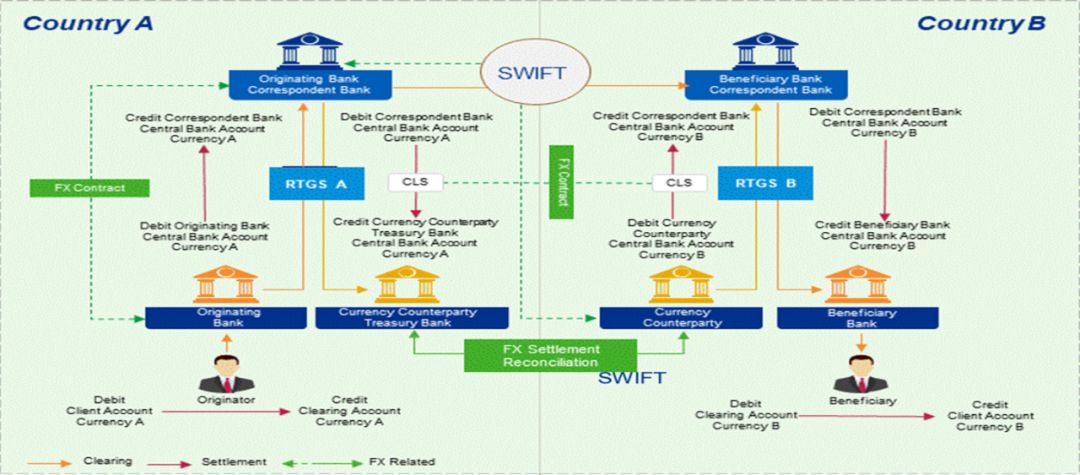 这张图综述了跨国支付的过程,在这个过程里,银行之间用 SWIFT 电文联系,而清算则是通过持续联系结算系统 CLS 在各央行有账户最后通过各国的 RTGS 完成清算。