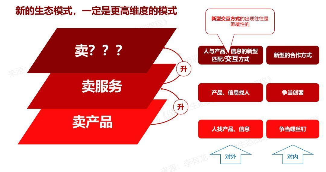 - 一个是对外为社会解决问题的部分,即新时代的生态中,企业需要找到一个人与产品,人与信息,人与人之间的新型匹配方式或者交互方式,新的交互方式的出现往往是颠覆性的。