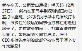 有人人车深圳员工便表示,在接到所有在职同事到深圳坂田办公室打卡坐班,公司将执行早中晚指纹打卡制的通知后,很多住的较远的同事也打算在附近租房子了,更有敬业的员工,打算直接住在公司了,“誓死追随公司共进退!”当然后面这一句,是反讽而已。