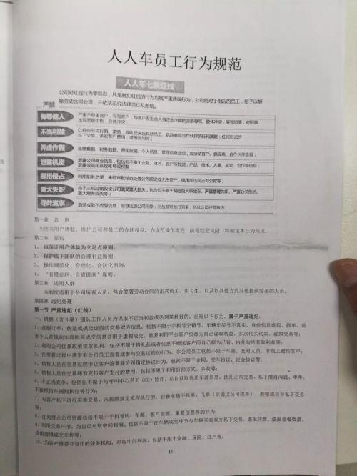 据蓝媒汇了解,所谓的红黄线规则,实际上就是《人人车员工行为规范》中对人人车员工做出的约束。比如7条红线,以及若干条细则等。该行为规范重点强调了员工不得有以下行为:与公司与客户进行私下买卖交易,自售车辆不报单、飞单、飞金融等。
