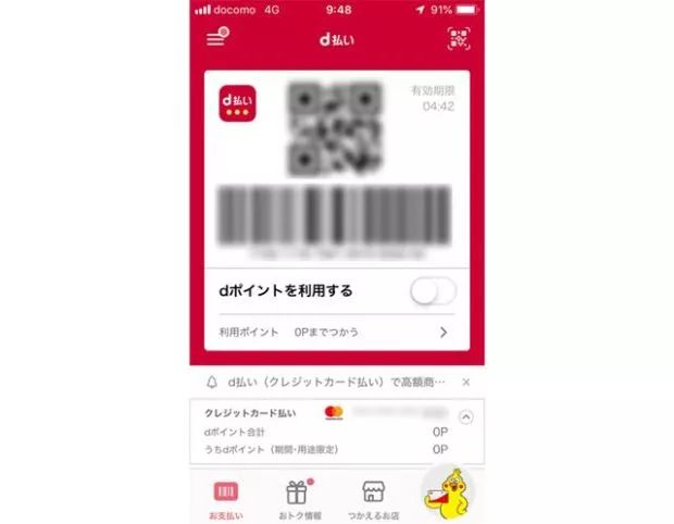 用“d支付”付款会积累d积分。在街上的店铺每花费200日元(含税)能够获得1个d积分(返积分率0.5%)。在网上店铺支付时,每100日元(含税)能够积累1个d积分(返积分率1%)。另外,在付款时使用的信用卡也会积累积分,即可以实现所谓的“积分重复领取”。例如,在使用返积分率为1%的d卡结账时,实际返积分率为1.5~2%。