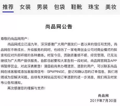 7月30日,奢侈品电商尚品网突然“猝死”,其在APP上发布公告表示,因融资重组不顺、经营受阻,已无法继续为广大用户提供服务,尚品网官网及APP将暂停营业。