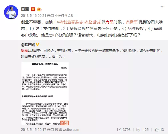 尚品网创始人赵世诚为雷军好友,而雷军也是尚品网的A轮投资人,投入了数百万人民币。成立后刚满一年,尚品网宣布收入突破两亿人民币,投资人雷军惊叹:“尚品网一年来的业绩超越了我的期望!”尚品网成立三周年之际,雷军还曾为尚品网创始人赵世诚加油。