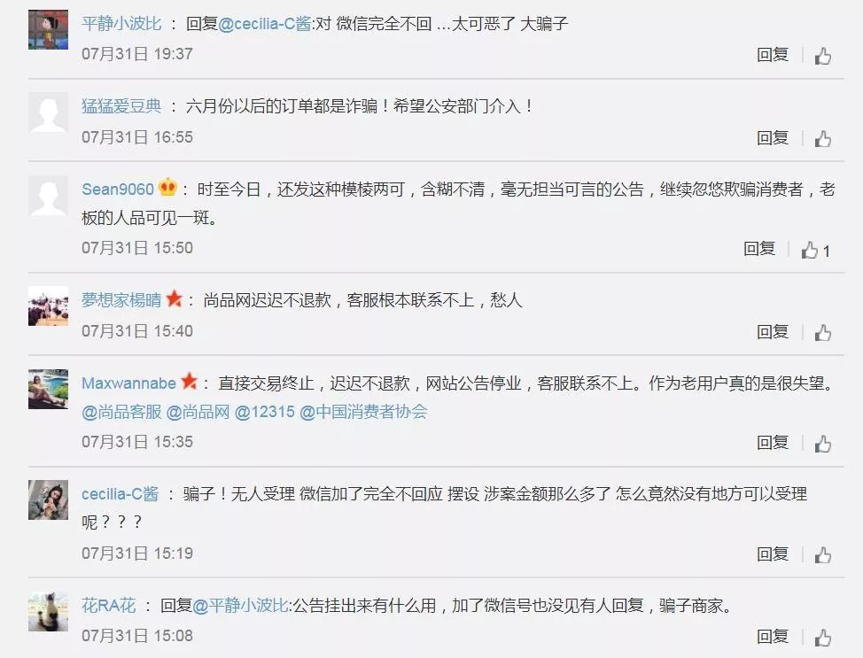 其实,早在今年5月尚品网便出现了部分订单出现发货及退款延迟,尚品网官方微博7月8日曾贴出这样一则安抚用户的公告,“近期进行重大融资和重组,自五月起部分订单出现发货及退款延迟情况……目前尚品网融资进展正常,现有业务仍将保持正常运营。”