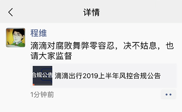 对此,滴滴出行CEO程维表示,滴滴对腐败舞弊零容忍,决不姑息。事实上,早在去年年初,滴滴便发布了《廉正行为奖励方案》,对公司内部举报或者拒收贿赂的员工进行奖励,包括荣誉激励、现金奖励等,最高可达10万元。