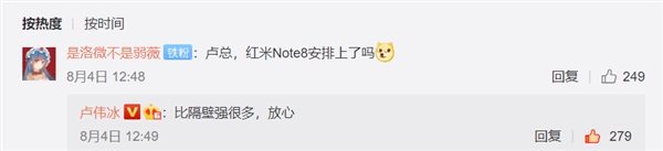 日前,有米粉询问卢伟冰:卢总,红米Note 8安排上了吗?卢伟冰回复:放心,比隔壁强很多。