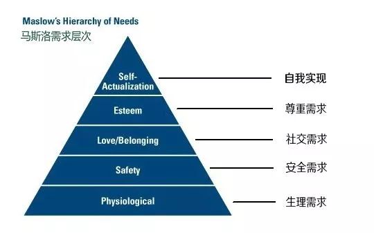 马斯诺需求层次图将人类需求划分为安全的需求、社交的需求、尊重的需求、自我实现的需求,以及最底层的生理需求。