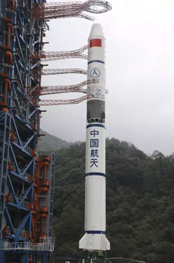 准确落在设定落区的残骸,是长征二号丙火箭的一部分,就是图中火箭中间那段深色的部分。