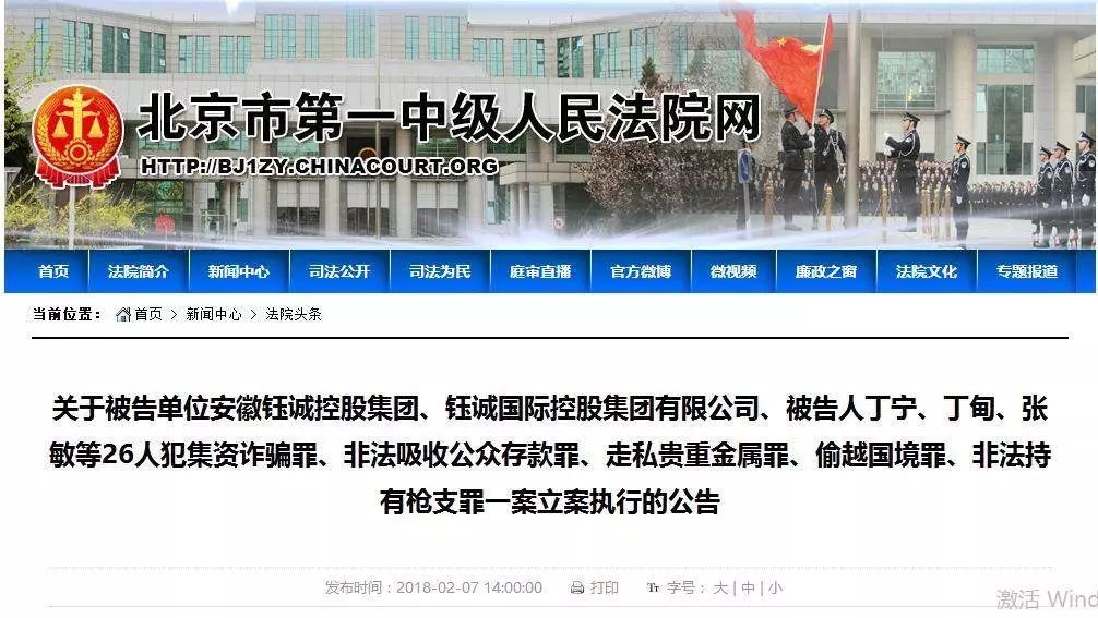 2月7日,北京市第一中级人民法院(以下简称“北京市一中院”)发布公告称,已对被告单位安徽钰诚控股集团、钰诚国际控股集团有限公司、被告人丁宁、丁甸、张敏等26人犯集资诈骗罪、非法吸收公众存款罪、走私贵重金属罪、偷越国境罪、非法持有枪支罪一案立案执行。