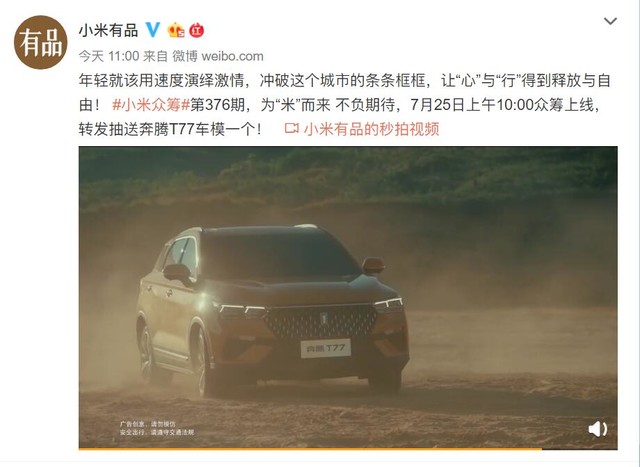 小米一直有着性价比的光环,不少人也期待啥时候有个小米汽车,小米啥时候进军房地产等等。小米进军房地产目前没啥消息,不过小米汽车倒是离我们很近。7月23日,小米有品官微宣布,奔腾T77将于7月25日10点上线小米有品进行众筹,年轻人的第一辆汽车来了!