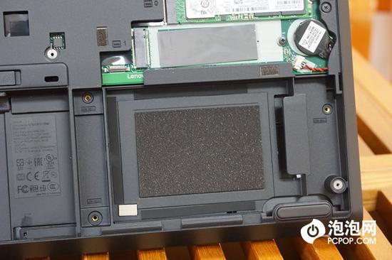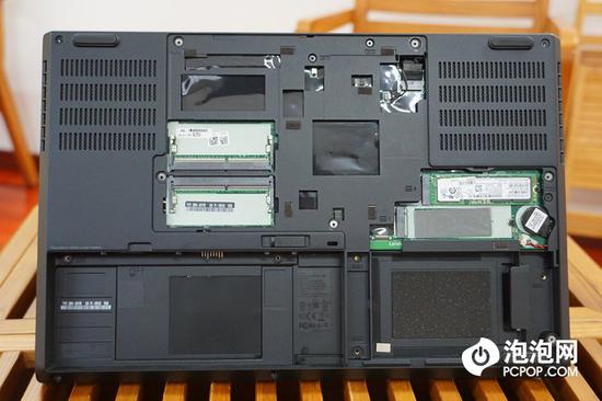 我们关机取下电池后对后盖进行了拆卸,可以很明显的看到可升级的硬件槽位,这些图上已经裸露出来的硬件以及空余插槽均有防静电贴纸,防止机内元器件被环境静电击穿。