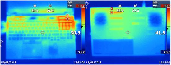 我们对这两款机型使用AIDA 64进行满载测试,在连续拷机1小时后,我们使用热成像仪对笔记本温度进行记录。