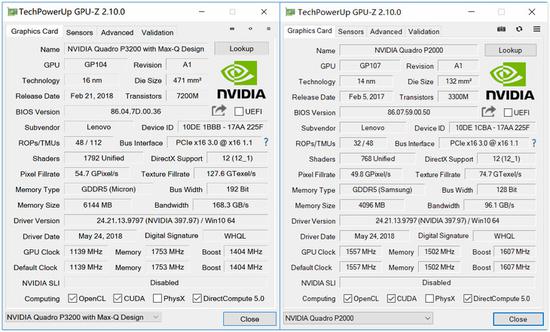 此次送测的两款机型分别搭载了两款不同型号的专业级显卡,分别为NVIDIA Quadro P3200 Max-Q 显卡以及NVIDIA Quadro P2000 显卡,两款显卡的硬件规格几乎完全不同,其中P3200的规格更为强大,Max-Q设计也会有更好的能耗比。