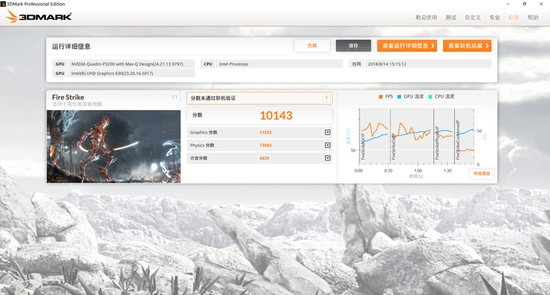 NVIDIA Quadro P3200 Max-Q 在3D MARK Fire Strike 的测试中取得了11552的图形分数。