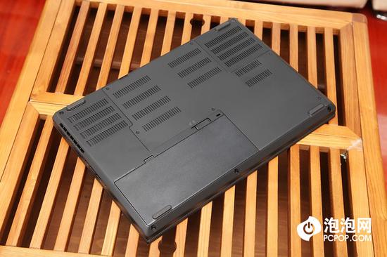 作为一款移动工作站电脑,密集的机身散热口是它的特征之一,ThinkPad P52机身有着丰富的散热孔,机身底部的散热口更是密集,主要集中在了D面的上半侧,四块橡胶材质的脚垫分布在机身四角,有效防止用户在使用过程出现滑动问题。