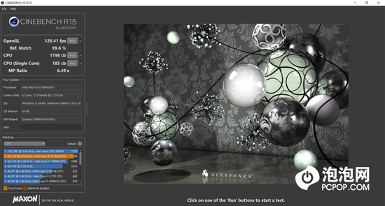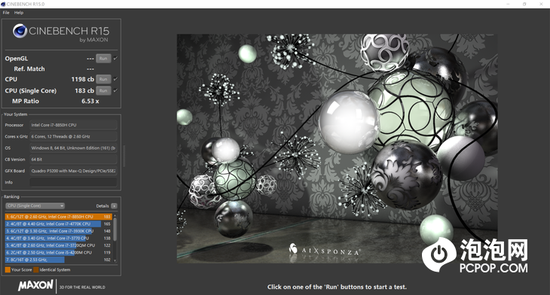 我们使用 CineBench R15来进行处理器性能测试,多核成绩1198cb,单核成绩183cb,总体表现十分优秀。