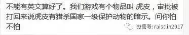 比如某同行说他的游戏中出现道具“虎皮”,被打回重审,说“有猎杀国家一级保护动物的暗示”。