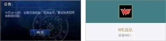 2012年,WE赢得了IPL5世界总冠军(IPL系列赛事不是官方赛事,由主办方直接邀请知名战队参加,而全球总决赛需要经过层层选拔才能进入,比IPL含金量更高)。当时,腾讯公布全服双倍经验、双倍金币,还有战队专属纪念图标庆祝WE夺冠。
