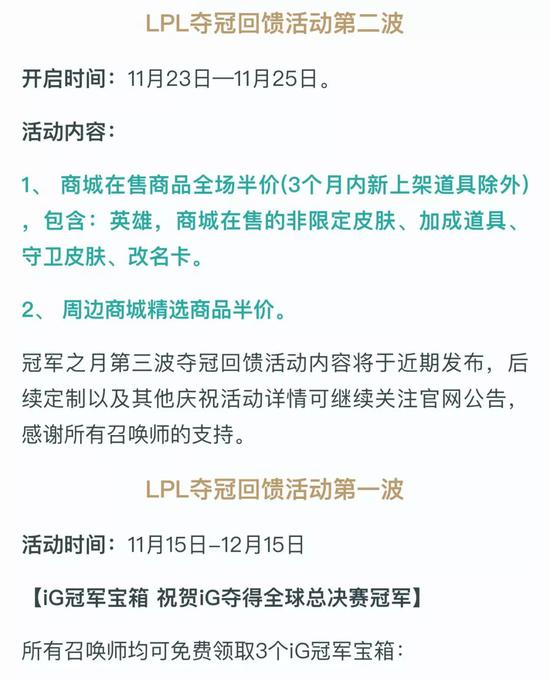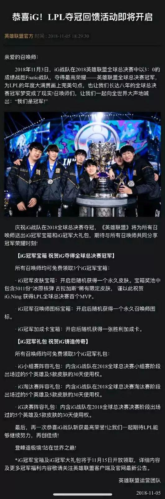 而如今,IG11月3日夺冠,官方直到11月5日才放出活动预告(后迫于压力改为第一波活动),但仅仅是永久皮肤一个,随机图标一个(excuseme??冠军限定的图标都不能给一个吗?),再加上战队此次总决赛使用的英雄及皮肤的30天使用权,没了。