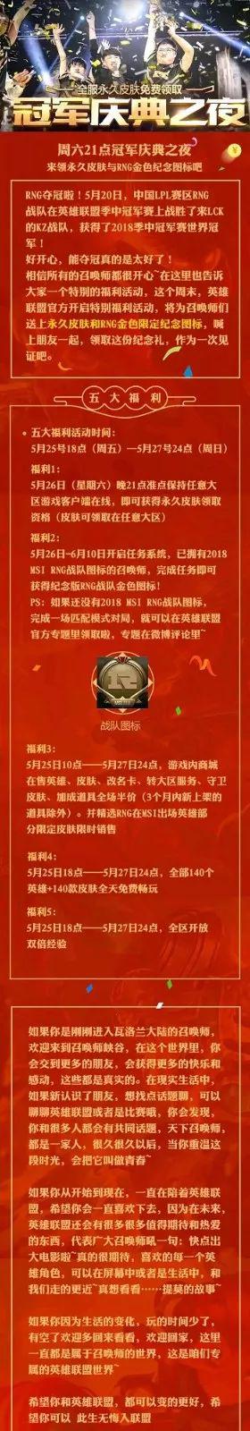 今年5月,RNG夺得了MSI(季中冠军邀请赛)的冠军,夺冠时千万粉丝同庆。那次官方很有作为,几个小时就推出了活动,又送永久皮肤,又送RNG金色限定纪念图标,还有什么商城全场半价,一共推出了五大福利。