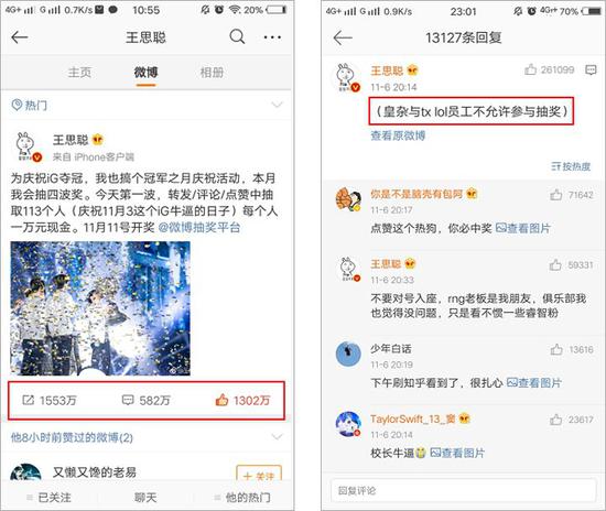 点进去一看,原来为了庆祝IG夺冠,王思聪要搞一个冠军之月庆祝活动,抽113个人发1万元现金红包,目前转发已经超过1500万!瞬间感觉到了王校长的威力。